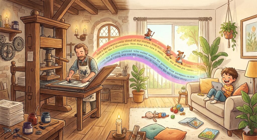 2. 知識の大衆化(たいしゅうか): 重くて高価だった本は、印刷技術のおかげで、みんなの手元に届くようになりました。