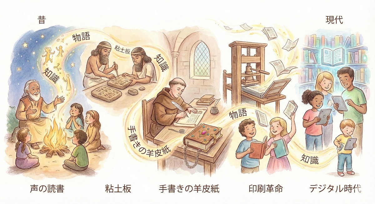 1. 始まりは「声」から: 読書は、人と人がお話を楽しむことから始まりました。