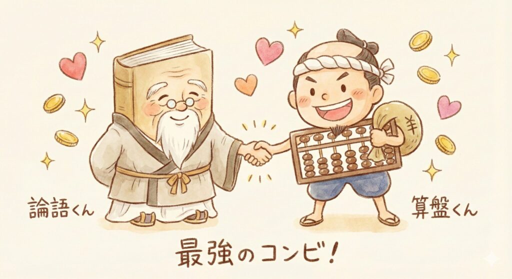 昔の日本(江戸時代など)では、「武士(侍)」は『論語』を読んで立派な心を持っていましたが、商売はしませんでした。逆に「商人」は『算盤』を使ってお金を稼ぎますが、世間からは少し低く見られていました。