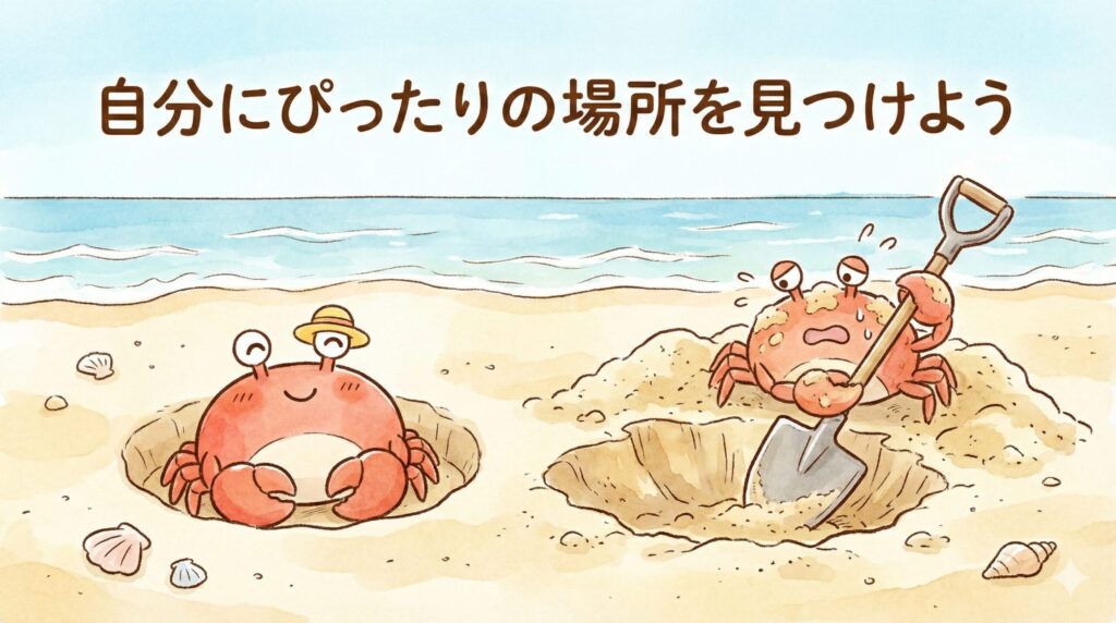 カニは、自分の甲羅(こうら)の大きさに合わせて、地面に穴を掘って住みます。 もし、小さなカニが「俺はライオンみたいに大きくなるぞ!」と言って大きすぎる穴を掘ったら、どうなるでしょう? 敵に見つかりやすくなったり、穴が崩れて埋まってしまったりするかもしれません。