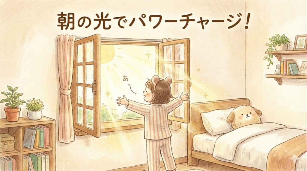 • 朝の習慣: 目覚まし時計で無理やり起きるのではなく、カーテンを開けて「太陽の光」を浴びましょう。太陽の光は、脳内の「幸せホルモン(セロトニン)」を出してくれます。 そして、深呼吸して新鮮な空気を吸い込みます。