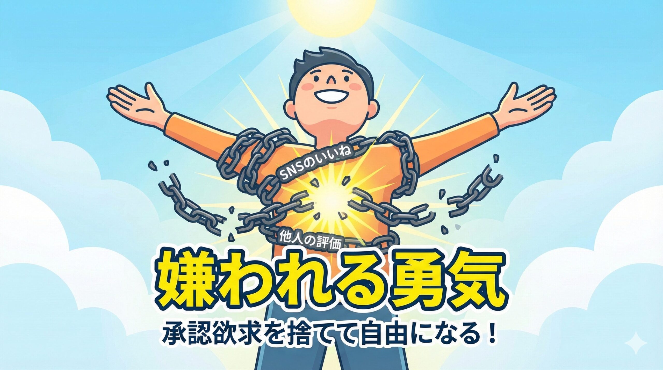 この本(『嫌われる勇気』)の先生(アドラーというすごい心理学者)は、この人間関係の悩みからたった一瞬で解放されて、自分らしくハッピーに生きるための、ものすごく勇気が出る方法を教えてくれるんだ。