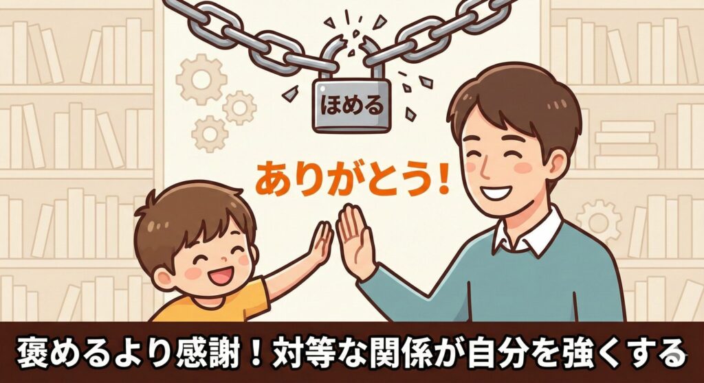 アドラー先生は、「褒めるんじゃなくて、『ありがとう』と感謝しましょう」と教えてくれるよ。