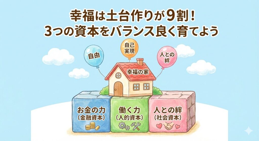 - 金融資本(お金)、人的資本(働く力)、社会資本(人との絆)という3つの土台をバランスよく作ること。