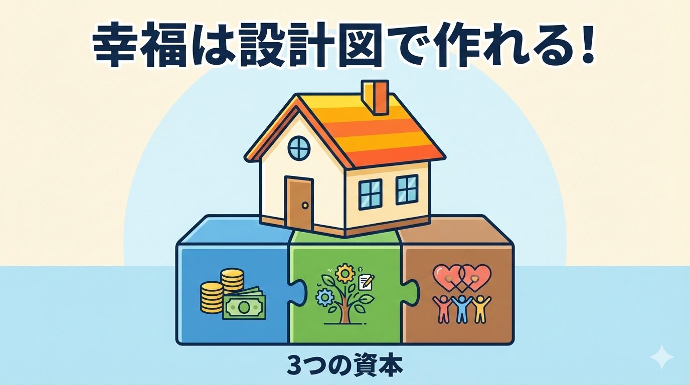 しかし、この本(橘玲さんの『幸福の「資本」論』)の先生は、「幸せは、運や気持ちの問題ではなく、正しい設計図としっかりした土台があれば、誰でも作れるものだよ」と教えてくれます。この本には、私たちが自分の人生を設計するための3つの特別な宝物(資本)の育て方が、具体的に、そして合理的に書かれているんだ。