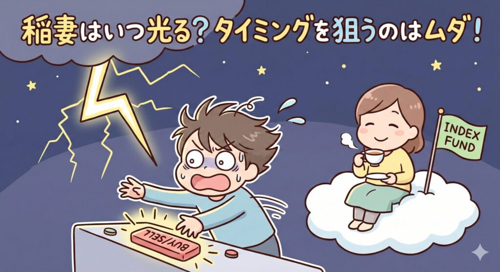 この「稲妻が輝く瞬間」の利益を確実につかむためには、相場から離れず、常に投資し続けること(ずっと買いっぱなし)しかありません。タイミングを見計らうのは、もはやギャンブルに近い行為なのです。