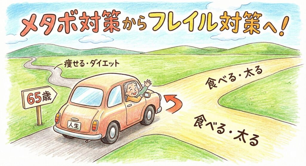 若い人(中年期くらいまで)は、生活習慣病予防のために、糖質制限やダイエットをして適正体重を保つべきですが、65歳、遅くとも70歳を過ぎたら、考え方をガラリと変える「ギアチェンジ」が必要です。