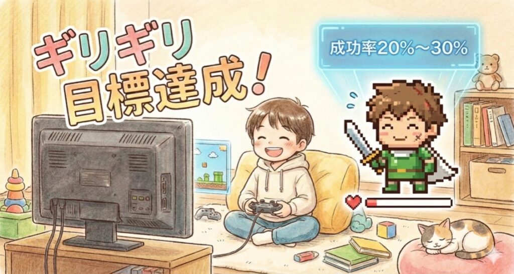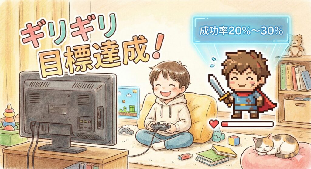 この設定をすると、成功率は自然と2〜3割に落ち着きます。失敗の方が多いけれど、たまに成功する。このランダムな成功体験が、ゲームのような中毒性を生み出し、飽きずに努力を継続できるようになるのです。